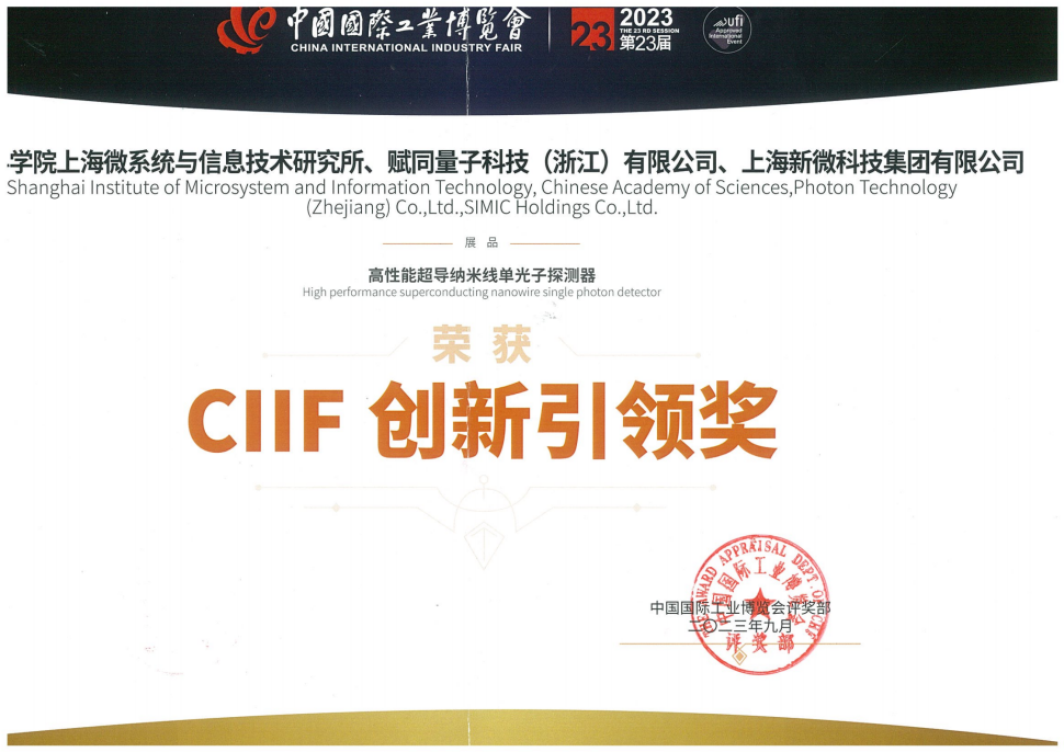 國家級工業(yè)領(lǐng)域展會第二十三屆中國國際工業(yè)博覽會(China International Industry Fair),參展企業(yè)超2800家,來自全球30個(gè)國家和地區(qū),近千項(xiàng)新技術(shù)新展品首展首發(fā),中國科學(xué)院上海微系統(tǒng)與信息技術(shù)研究所、賦同量子科技(浙江)有限公司、上海新微科技集團(tuán)有限公司聯(lián)合研發(fā)的參展展品“高性能超導(dǎo)納米線單光子探測器”榮獲CIIF創(chuàng)新引領(lǐng)獎(jiǎng)。