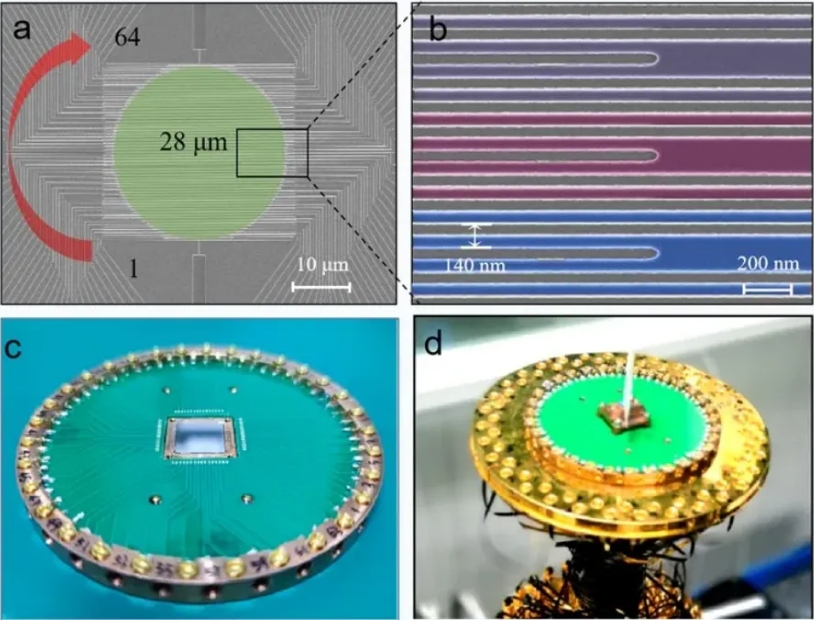 (a)器件結構,(b)超導納米線,(c)器件封裝,(d)制冷系統(tǒng)