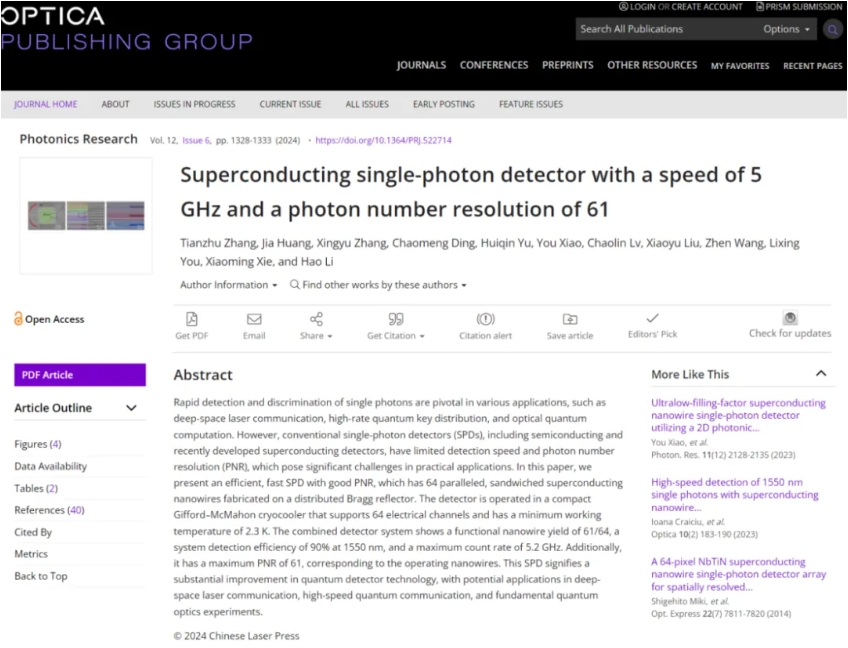 近日,中國科學院上海微系統(tǒng)所李浩、尤立星團隊,利用三明治結構超導納米線、多線并行工作的方式實現(xiàn)最大計數(shù)率5GHz、光子數(shù)分辨率61的超高速、光子數(shù)可分辨光量子探測器,相關成果以“Superconducting single photon detector with speed of 5 GHz and photon number resolution of 61”為題于2024年5月31日在線發(fā)表在中國科學院一區(qū)學術期刊《光子學研究》(Photonics Research)上,并入選編輯推薦(Editor's Pick)。