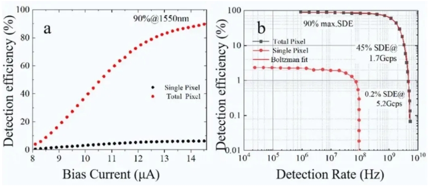 (a)器件探測效率隨偏置電流的變化關系,(b)探測效率隨探測速率的變化關系