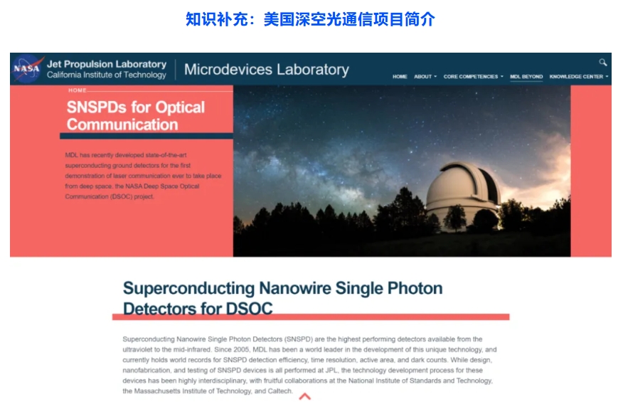 SNSPD是從紫外到中紅外范圍內(nèi)綜合性能最優(yōu)的單光子探測器,因此成為美國國家航空航天局(NASA)和噴氣推進實驗室(JPL)深空光通信(Deep Space Optical Communications,DSOC)項目的重要支撐研發(fā)項目。自2005年以來,MDL在這一獨特技術的開發(fā)方面一直處于世界領先地位,并且在探測效率、時間分辨率、有效面積和暗計數(shù)方面保持著世界紀錄。