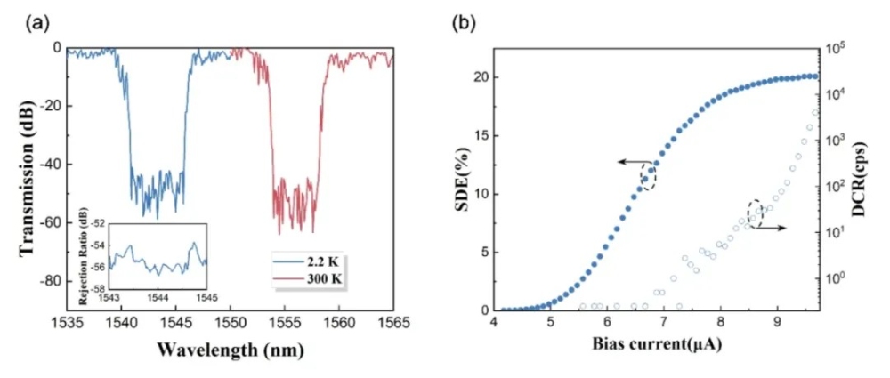 圖3 片上泵浦濾波器與SNSPD性能表征結(jié)果。