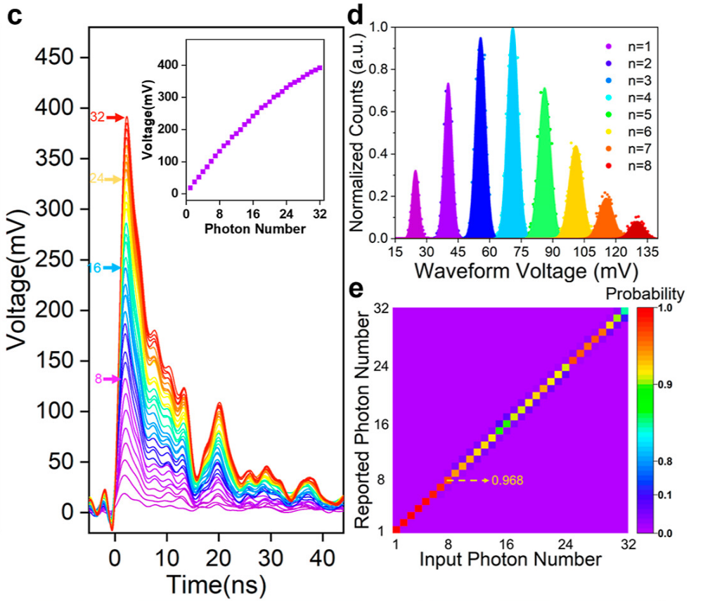 通過這種設(shè)計,探測器能夠準確區(qū)分1到32個入射光子。實驗中,當入射光子的平均數(shù)量為5時,示波器上能清晰觀察到8個分離的高斯峰,分別對應(yīng)1到8個光子;通過掃描光強,最多可觀察到32個高斯峰,證明了探測器卓越的光子數(shù)分辨能力。